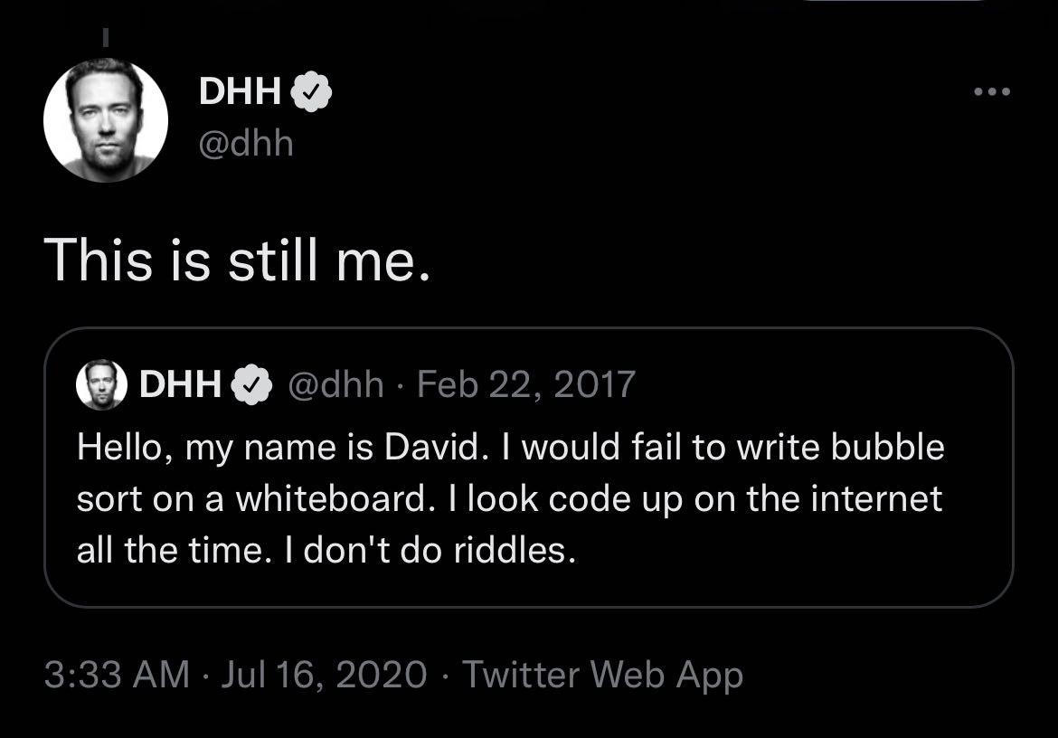 Đây là một đoạn tweet của David Heinemeier Hansson, người tạo ra framework nổi tiếng Ruby on Rails, đồng sáng lập Basecamp và HEY, đồng thời là một tay đua xe có tiếng (ông này đa tài ghê 😎).