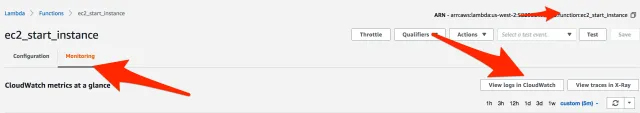 Lambda function --> Monitoring --> View logs in CloudWatch