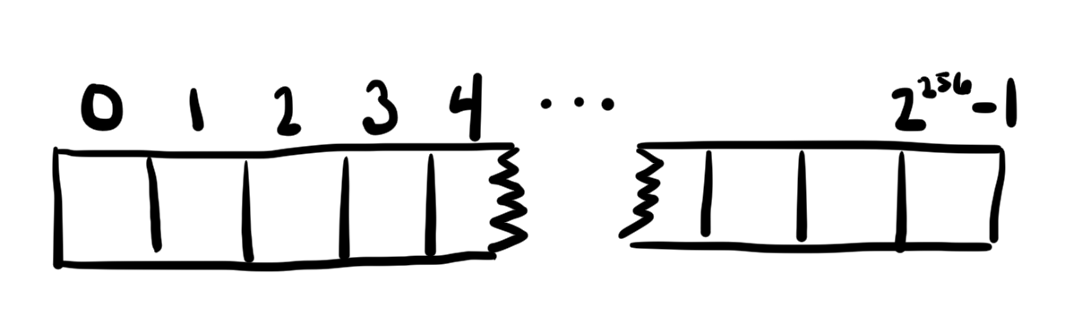 Mỗi smart contract chạy trên máy ảo Ethereum (EVM) đều được cấp một dung lượng nhớ nhất định gọi là storage. Storage này có tổng cộng tất cả slot nhớ, tương đương với khoảng slot nhớ.