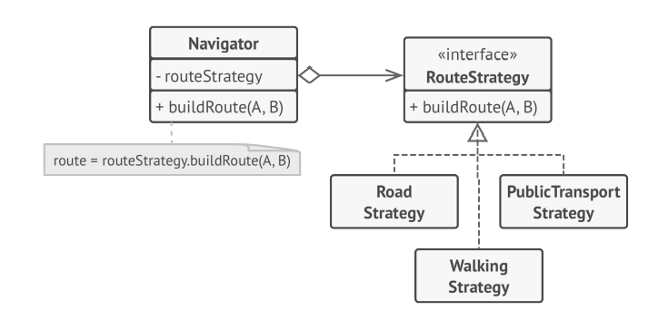 Giả sử chúng ta cần xây dựng một app giúp tìm đường đi trong thành phố. Ban đầu app chỉ giúp những người đi bộ tìm đường đi, chúng ta chỉ việc viết thuật toán này ở bất kỳ chỗ nào cần. Nhưng sau này khi yêu cầu tăng lên như phải hỗ trợ thêm việc tìm đường bằng xe hơi, xe đạp,.. Điều này dẫn đến phải thay đổi thuật toán ở những chỗ đã sử dụng, Điều này có thể khiến chương trình trở nên khó maintain và nhiều khi còn gây nên những bug trên những phần đang hoạt động tốt