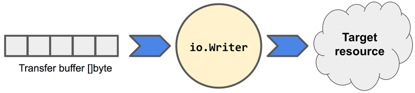 Người viết, được đại diện bởi giao diện io.Writer, truyền dữ liệu từ bộ đệm và ghi nó vào tài nguyên đích như minh họa bên dưới: