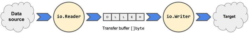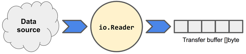Một trình đọc, được đại diện bởi giao diện io.Reader, đọc dữ liệu từ một số nguồn vào một bộ đệm truyền , nơi nó có thể được truyền trực tuyến và sử dụng, như được minh họa bên dưới: