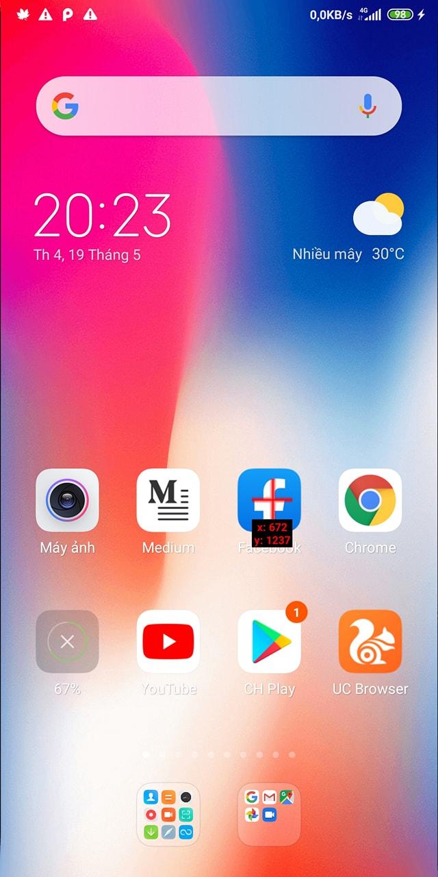 Cách để chúng ta có thể giao tiếp với điện thoại Android là sử dụng shell, qua đó chúng ta có thể gửi các command line để giả lập các thao tác như vuốt màn hình, gõ phím, nhấn vào vị trí bất kỳ trên màn hình, blabla À mà để nhấn vào vị trí bất kỳ trên màn hình thì cách ez nhất là chúng ta phải xác định tọa độ trên màn hình và tọa độ trên điện thoại sẽ được tính toán như sau :