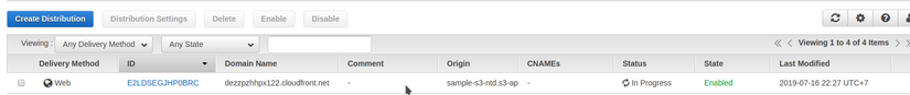 Tương tự với S3, ta có thể quản lý CloudFront thông qua trang CloudFront Management. Ở trang này, tạo một distrubtion băng cách click vào Create Distribution