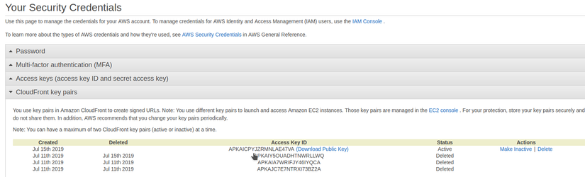 Ok. Đăng nhập vào root user, vào trang My Security Credentials. Ở đây ta có thể thấy CloudFront key pairs.