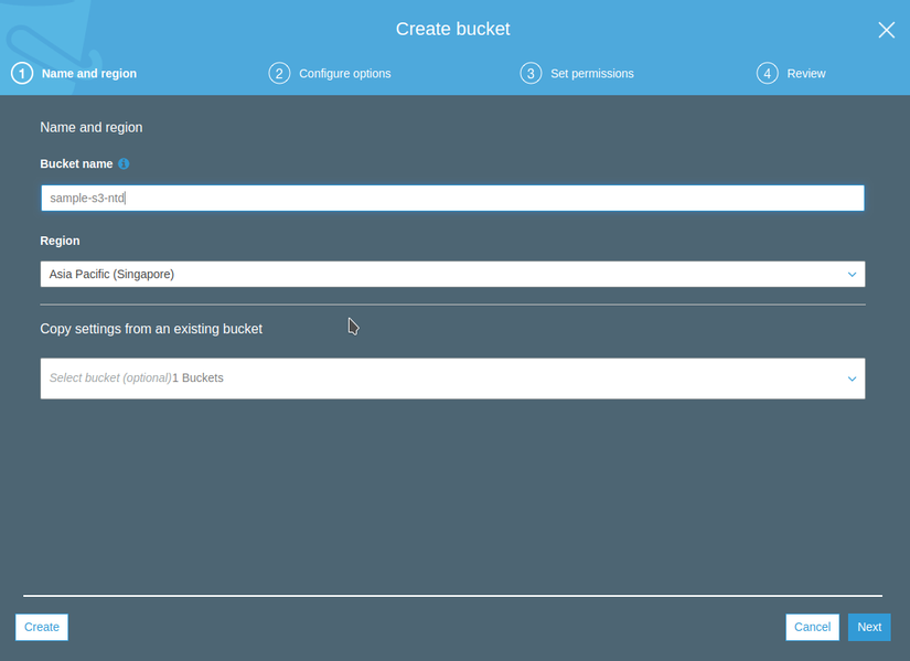 Quay lại bài toán lúc đầu, mình sẽ cần một bucket trên S3. Trong trường hợp chưa có, ta có thể tạo một cái mới. VD ở đây mình sẽ tạo một bucket S3 mới với tên sample-s3-ntd.