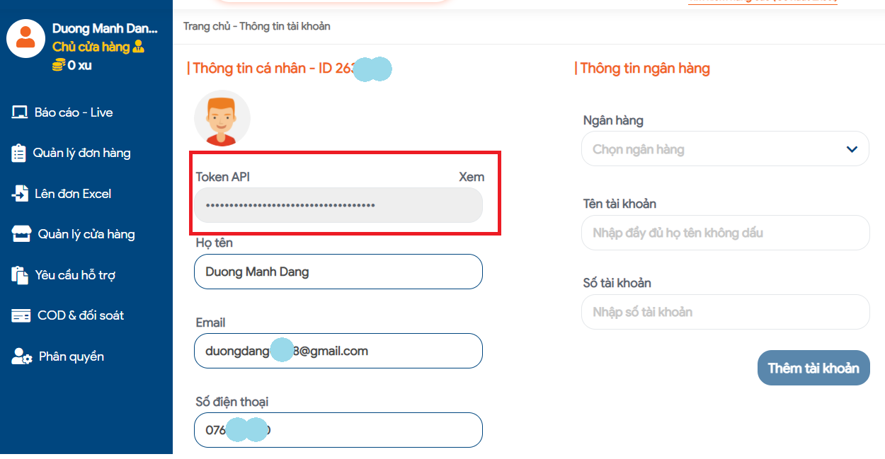 - B3: Tại ô Token API, nhấn Xem để lấy Token.