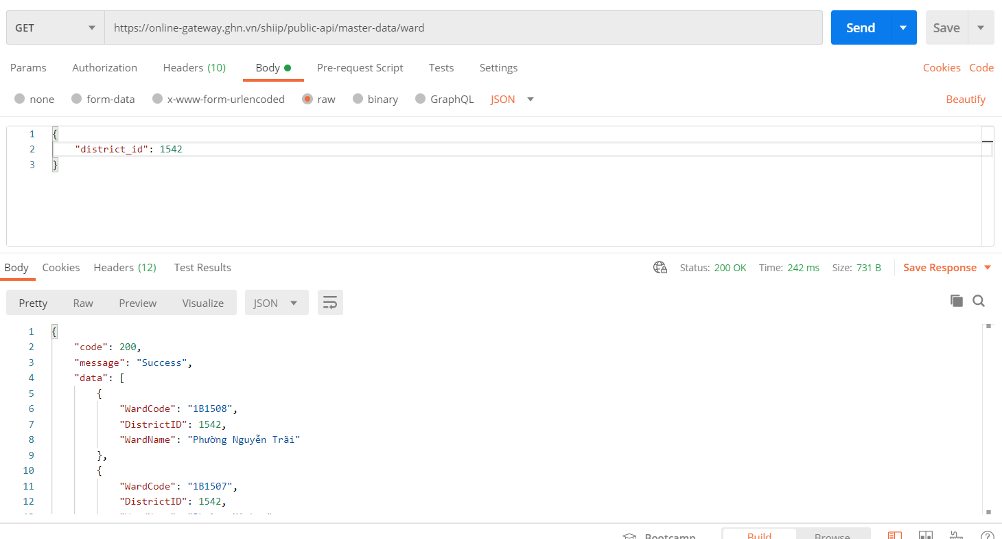 Vì thành phố Hà Nội có province_id là 201 nên mình sẽ truyền param province_id=201 dưới dạng json vào Body. Kết quả trả về thành công sẽ như sau: