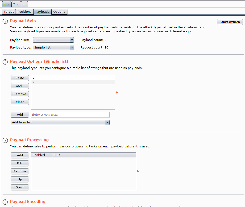 payloads. Số lượng payloads thì tùy vào loại tấn công được xác định trongPositions. Đối vớifuzzing parametershaybrute forcethì thường sử dụng 1 bộ payloads duy nhất.