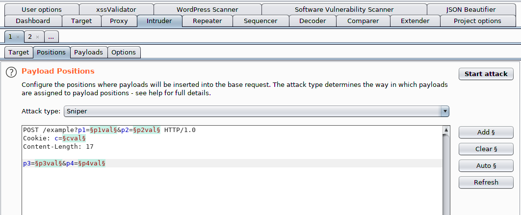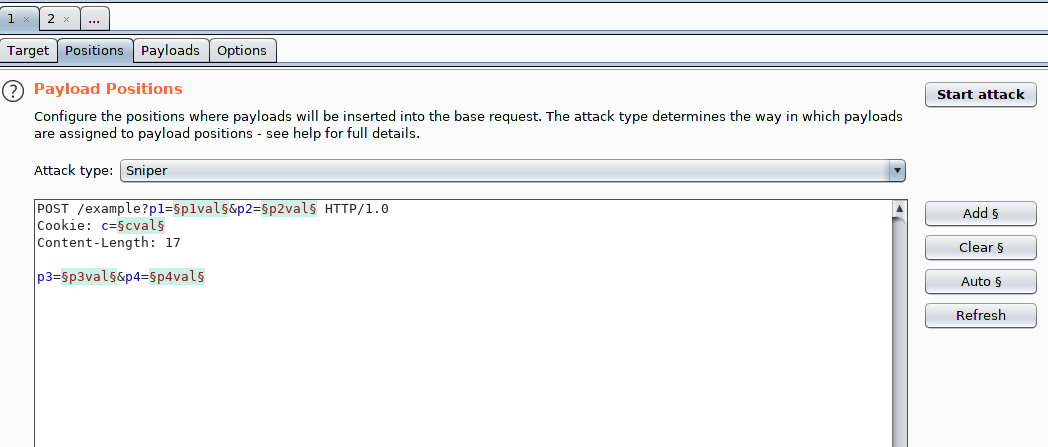 tô màutừng cặp dấupayloadsvà bất kỳ ký tự hay văn bản nào bên trong chúng. - Add §, Clear §, Auto §, Refresh khá là dễ dàng, bạn đọc tự tìm hiểu nha ^^