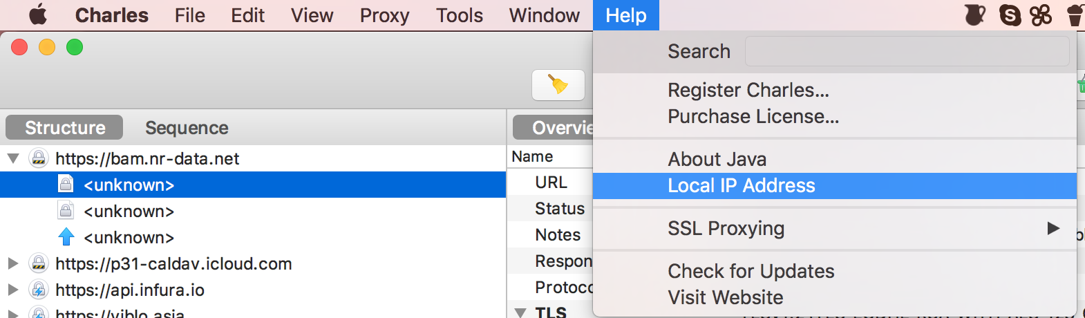 Để biết địa chỉ IP của máy bạn có thể vào Help -> Local IP addess trên toolbar của Charles