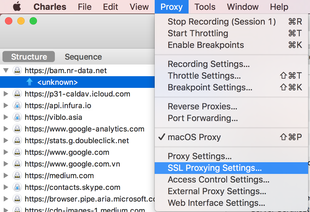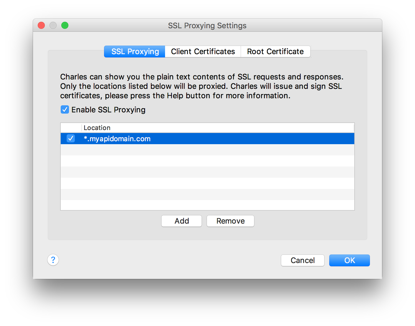 SSL Proxyingvà check vàoEnable SSL Proxying. - Ấn vào nút add để chỉ định tên domain muốn lắng nghe. Bạn có thể sử dụng wildcard ví dụ như