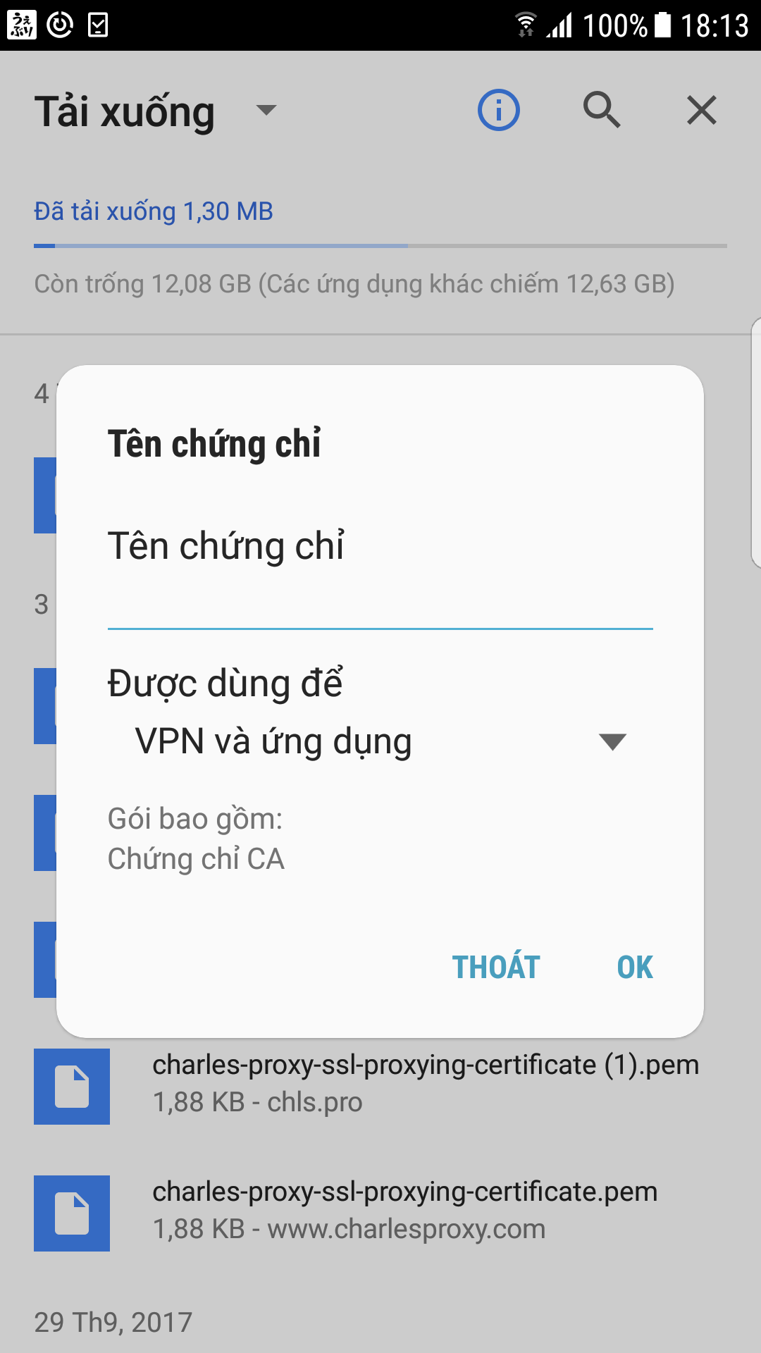 - Sau khi download xong certificate, click vào để mở file đó. Android sẽ hiển thị mội dialog để bạn cài đặt file này, nhập tên chứng chỉ sau đó nhấn OK. Tên chứng chỉ bạn nhập gì cũng được, ở đây mình nhập luôn là