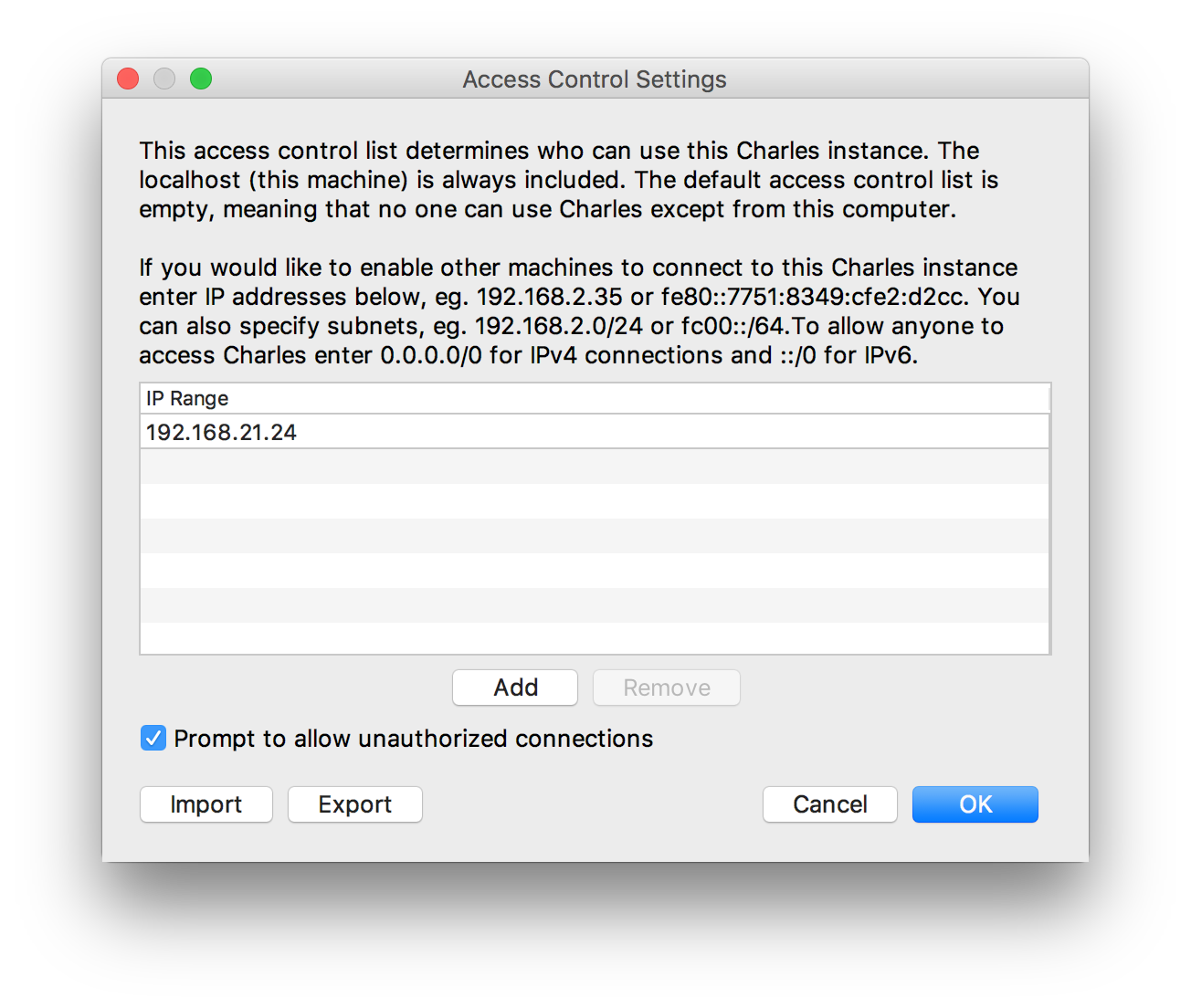 Proxy -> Access Control Settingsvà thêm vào địa chỉ IP của máy điện thoại của bạn vào đó.