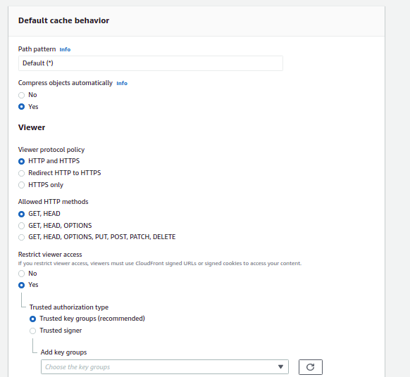 - Trusted key groups: được coi là best practice để sử dụng. Lí do là vì chúng ta có thể tạo ra trusted key group từ một IAM account, không cần phải sử dụng tới root account. như vậy sẽ phát sinh rất nhiều rủi ro. Để tạo ra trusted key group khá đơn giản các bạn chỉ cần follow theo link hướng dẫn ở đây. Rồi sau đó chọn Trust key group tương ứng
