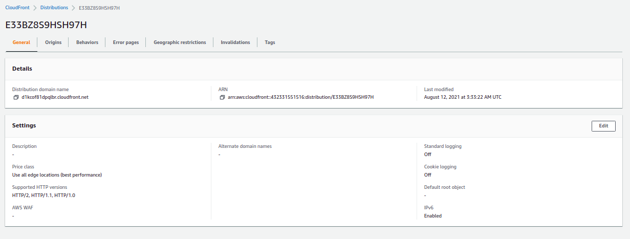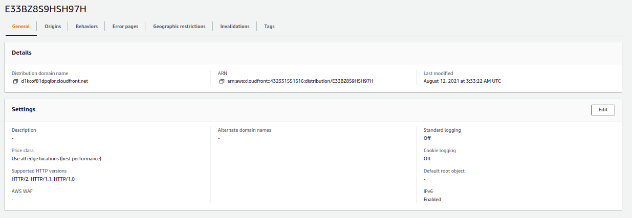 Bạn sẽ thấy rằng có "Origin Access Identity E2WBU6DZ3ZPV3P" chính là ID của OAI chúng ta đã lựa chọn. Như vậy là Distribution đã có thể acceses được tới S3 bucket để đọc các file nội dung trong đó.