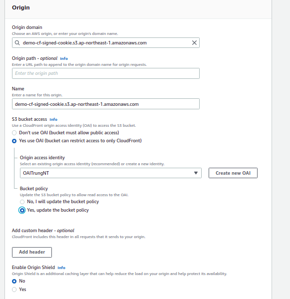 - Origin domain: chính là S3 bucket mà mình đã tạo trước đó demo-cf-signed-cookie.s3.ap-northeast-1.amazonaws.com. Bạn chỉ cần lựa chọn đúng S3 bucket bạn muốn tạo là được