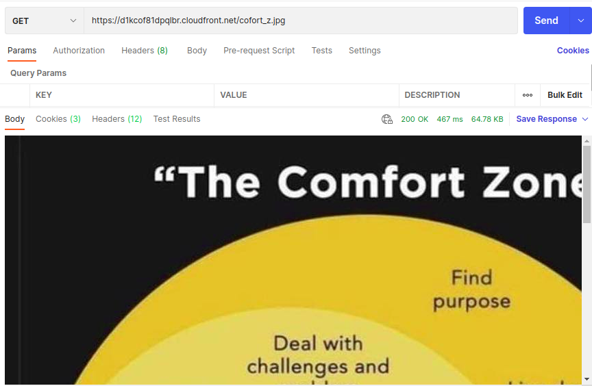 Khi thực hiện request tới https://d1kcof81dpqlbr.cloudfront.net/cofort_z.jpg bằng postman chúng ta vẫn nhận được kết quả báo lỗi. Bây giờ chúng ta sẽ tiến hành set cookies cho domain tương ứng. Các bạn có thể chọn vào nút Cookie màu xanh để add domain và cookie value tương ứng như các hình