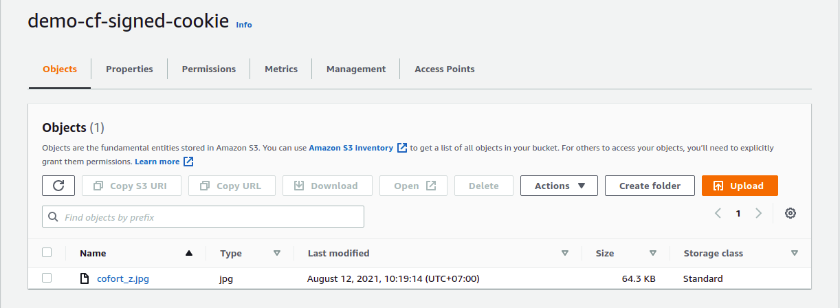 Trong ví dụ này mình sẽ sử dụng một bucket có tên là demo-cf-signed-cookie và một file tải lên là cofort_z.jpg