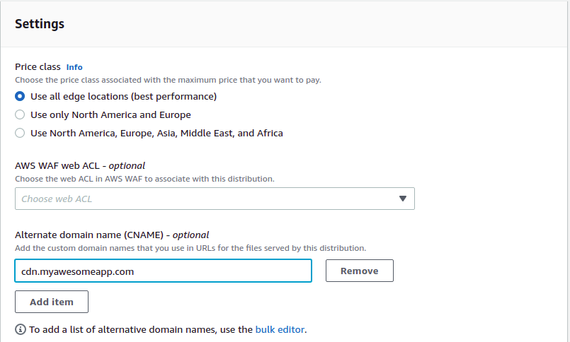 Ở đây chúng ta sẽ thấy "Alternate domain name (CNAME) - optional". Có thể thêm một sub domain như là cdn.myawesomeapp.com