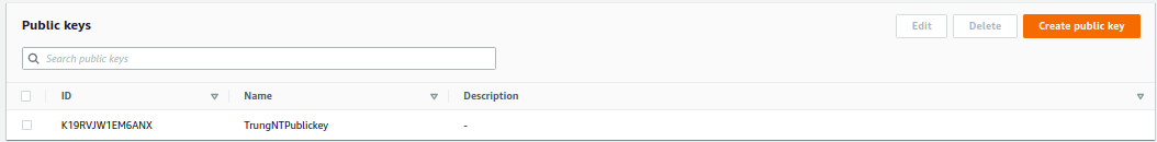 - key_pair_id: Như nội dung ở trên đã viết, mình sử dụng trusted key group để làm Trusted authorization type. Nên id truyền vào ở đây chính là ID của public key mà chúng ta đã tạo ra ở trên dùng cho trusted key group. Như hình sau