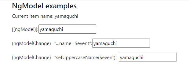 <input [ngModel]="currentItem.name" (ngModelChange)="setUppercaseName($event)" id="example-uppercase">