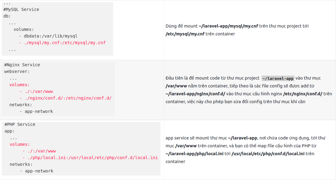 Giải thích file docker-compose.yml 1 chút, ở đây chúng ta xác định có 3 services là : app, webserver và database