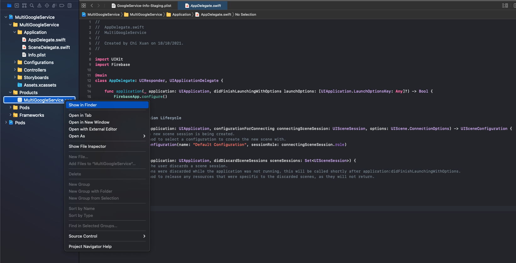 Nếu mọi thứ bình thường bạn sẽ thấy 1 file tên là GoogleService-Info.plist, đây chính là file mà Firebase sẽ configure. Bạn mở file này lên và so sánh với file GoogleService-Info-Debug.plist, nếu nó giống nhau thì chứng tỏ bạn đã quản lý các file thành công rồi đó. Tương tự hãy kiểm tra ở môi trường "Staging" và "Release" và xem kết quả nhé.