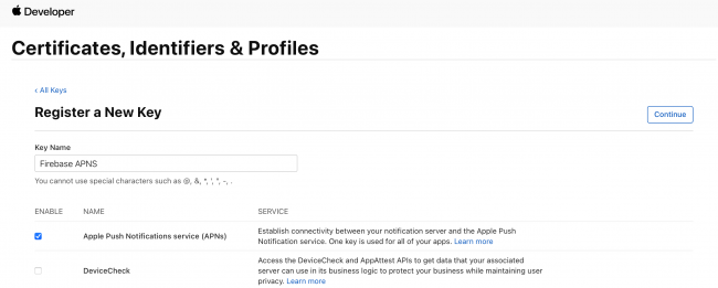 Đặt tên cho nó và kích hoạt dịch vụ Apple Push Notifications service (APN). Chọn Tiếp tục và trên màn hình tiếp theo, hãy chọn Đăng ký.