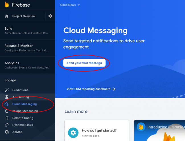 Bây giờ, hãy chuyển đến dự án Firebase của bạn và chọn Nhắn tin qua đám mây được tìm thấy trong Tương tác. Sau đó chọn Gửi tin nhắn đầu tiên của bạn.