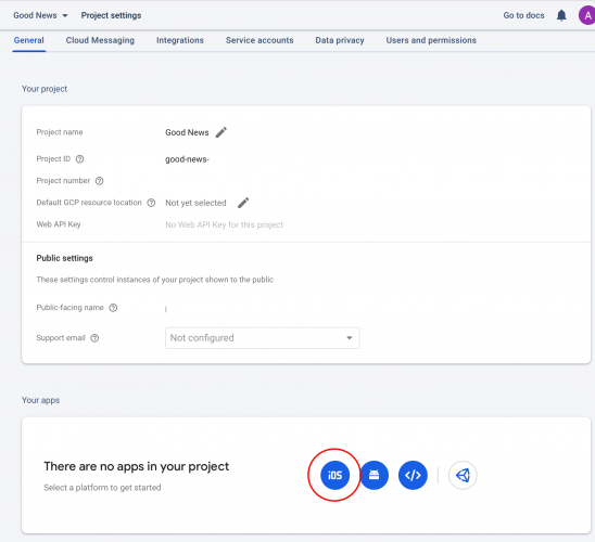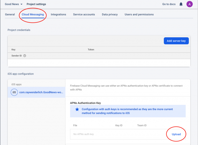 Từ đó, hãy chuyển đến trang cấu hình ứng dụng: Thêm số nhận dạng gói cho dự án của bạn. Bạn có thể để trống App nickname và ID Apple store. Sau khi đăng ký ứng dụng của bạn, hãy tải xuống GoogleServices-Info.plist. Bạn sẽ cần cái này để định cấu hình Firebase trong ứng dụng của mình sau này. Bạn có thể chọn Tiếp theo cho các bước còn lại. Bạn sẽ không sử dụng CocoaPods và hiện tại bạn có thể bỏ qua các bước để thêm mã khởi tạo vào ứng dụng của mình. Tiếp theo, tải lên chứng chỉ p8 của bạn bằng cách đi tới Cloud Message trong cài đặt dự án Firebase của bạn. Trong Khóa xác thực APN, hãy chọn Tải lên.