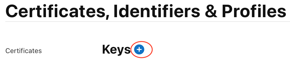 Tiếp theo bạn cần config, add Firebase vào dự án của chúng ta Firebase yêu cầu bạn tải chứng chỉ p8 lên ứng dụng của mình. Đây là một tệp đặc biệt chứa khóa riêng tư cho phép Firebase gửi thông báo. Để nhận chứng chỉ p8, hãy đăng nhập vào Apple Developer. Chọn Certificate, Identifiers & Profiles và đi tới Key. Chọn nút + để tạo khóa mới.