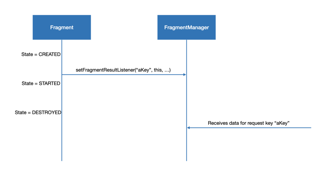 Ở đây FragmentA thực hiện việc lắng nghe kết quả trả về từ FragmetB bằng việc gọi phương thức setFragmentResultListener() ở hàm khởi tạo, tham số truyền vào lifecycleOwner chỉ cho phép nhận dữ liệu nếu nó ít nhất ở trạng thái STARTED. Nếu chính LifecycleOwner là Fragment thì bạn có thể cập nhật giao diện một cách an toàn khi dữ liệu mới được cập nhật, vì view sẽ được tạo tại thời điểm đó (onViewCreated() được gọi trước onStart()):