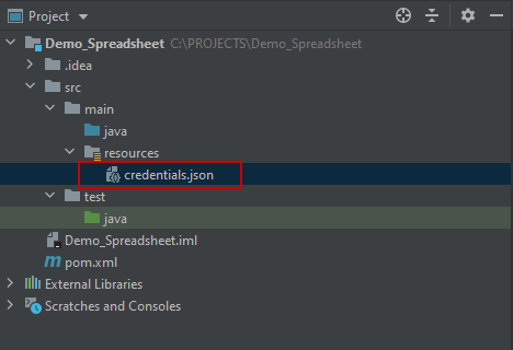 Lưu trữ file credentials.json vào thư mục resources của dự án. Ở đây mình sẽ tạo 1 project để demo