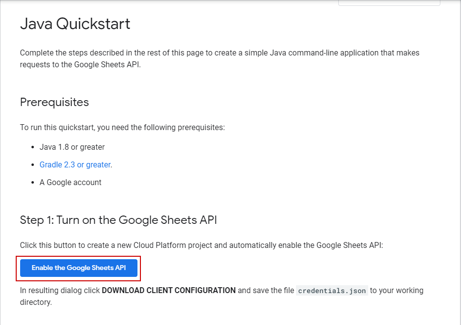 Truy cập https://developers.google.com/sheets/api/quickstart/java và chọn "Enable the Google Sheets API"