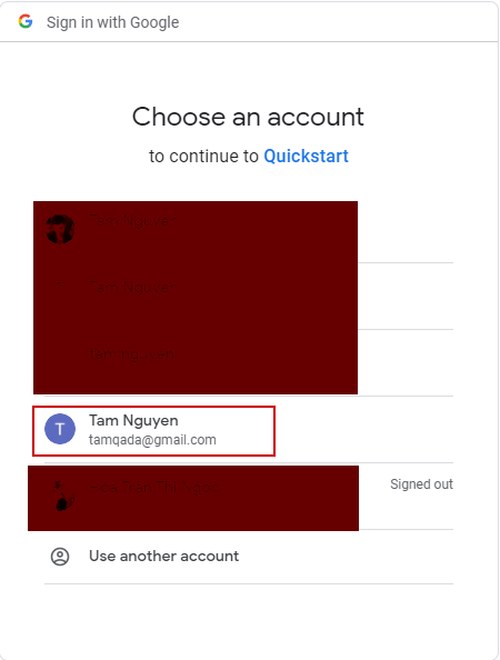 Khi run test ở lần đầu tiên, một cửa sổ mới sẽ được mở ra. Chọn tài khoản đã sử dụng để Enable Spreadsheet API để cấp quyền cho file Credentials.json: