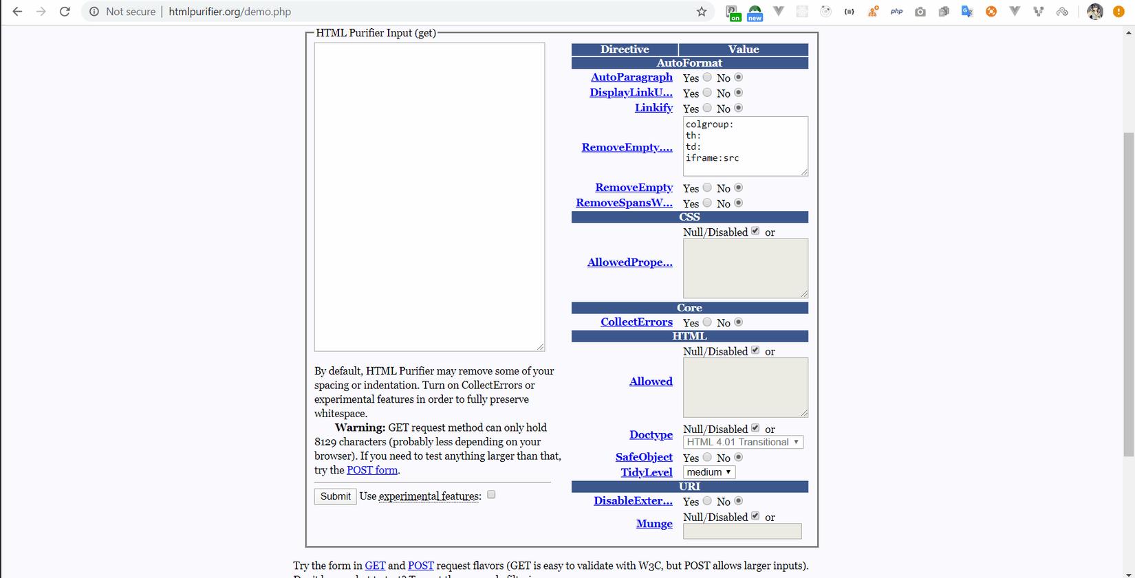 Với HTMLPurifier bạn không cần phải điền list thẻ html nữa, thay vào đó là ta whitelist các attribute thôi ví dụ như class, url, ... rất là tiện đúng không nào.