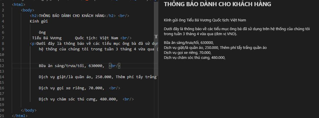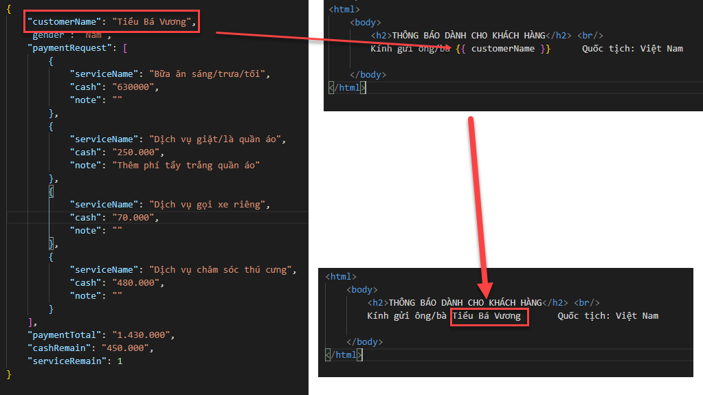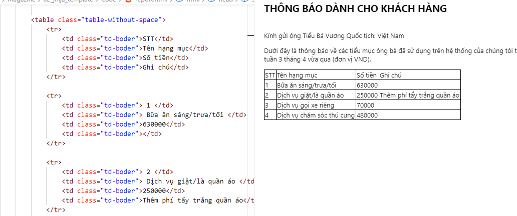 Áp dụng tiếp vào bài toán trên, ta thực hiện thay đổi template.html bằng cách thêm vào body đoạn code:
