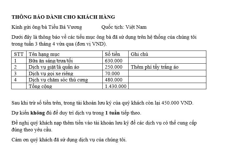 Đề nghị quý khách nạp thêm tiền vào tài khoản lưu ký để các dịch vụ có thể cung cấp đúng theo yêu cầu.