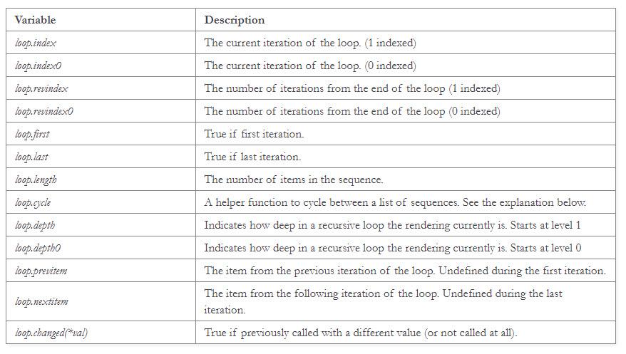 Trong block code for-loop thì loop.index, loop.index0,… được gọi là special variables.