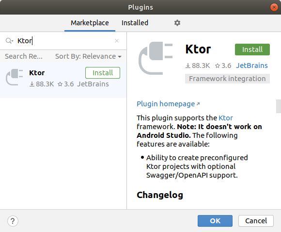 Tiếp đến chúng ta search Ktor và cài đặt plugin này.