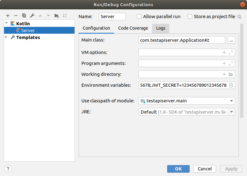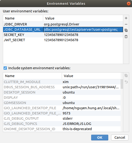JDBC_DRIVER=org.postgresql.Driver JDBC_DATABASE_URL=jdbc:postgresql:testapiserver?user=postgres; SECRET_KEY=123456789012345678 JWT_SECRET=123456789012345678Các thông tin có ý nghĩa lần lượt là