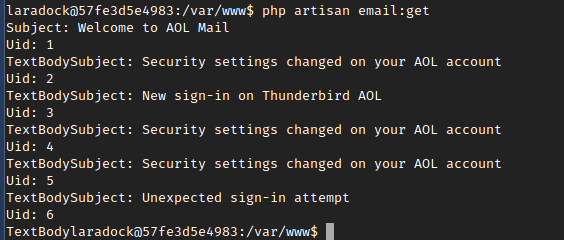 Ví dụ đơn giản chức năng kiểm tra đã kết nối thành công chưa với tài khoản AOL mail Ta có thể tạo một command trong laravel để kiểm tra, ở đây tôi tạo command email:get