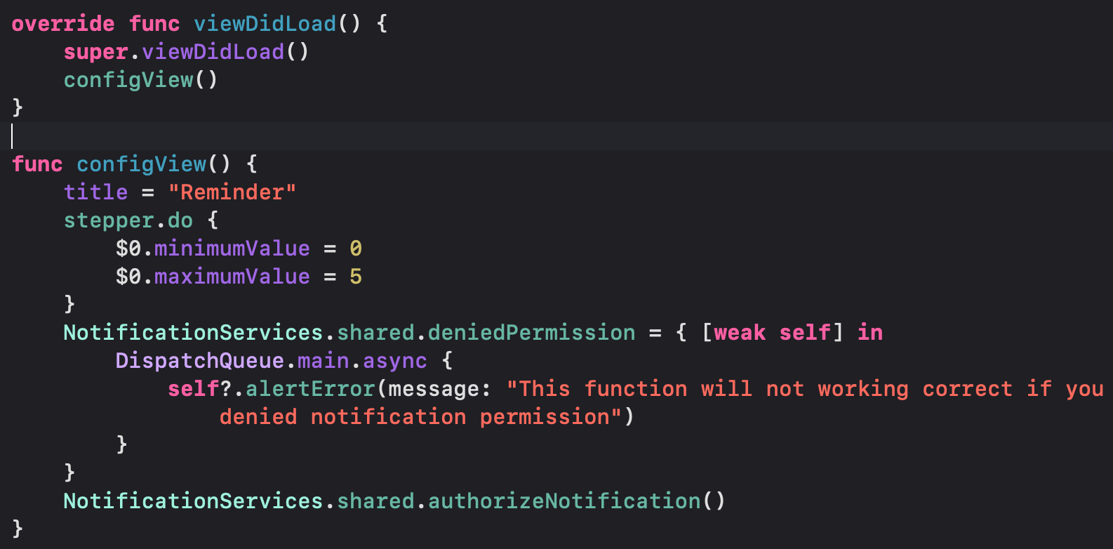 Sau đó chúng ta sẽ vào trong ViewDidLoad của màn hình Reminder rồi đến hàm authorizeNotification, như vậy, khi người dùng click vào màn hình này thì thông báo yêu cầu quyền truy nhập sẽ được kích hoạt.