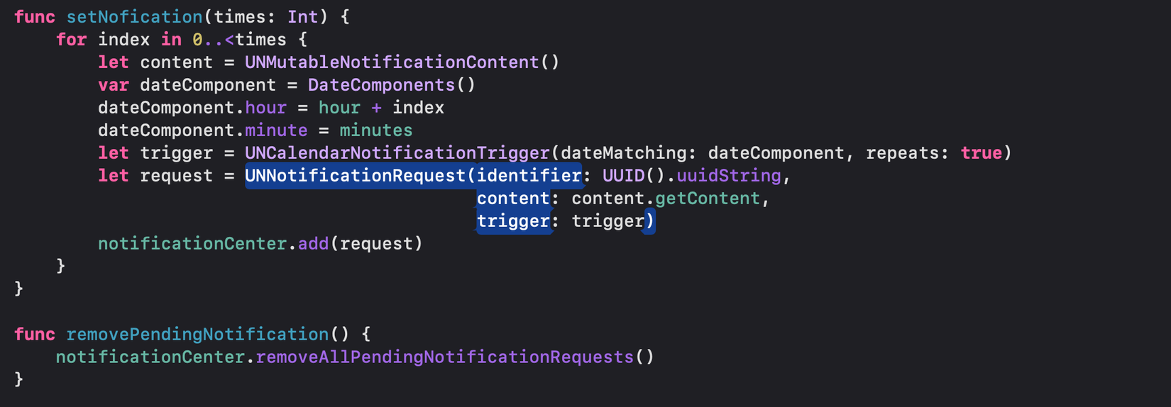 let request = UNNotificationRequest(identifier: UUID().uuidString, content: content, trigger: trigger)
