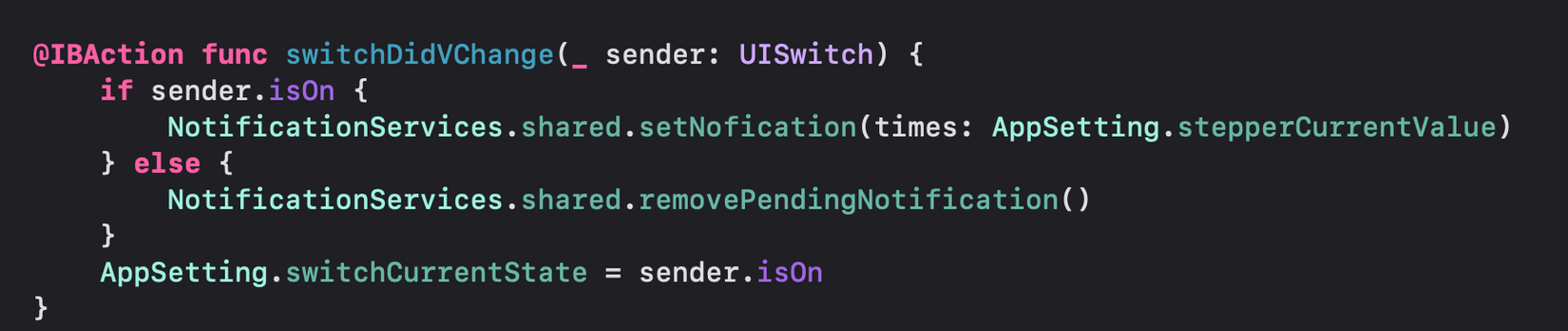 Như vậy, mỗi lần mình bật tính năng này, app sẽ tự động gửi thông báo cho mình vào một khung giờ cố định hằng ngày. Thông báo đầu tiên sẽ được gửi vào 7h30 sáng, mỗi thông báo sẽ được gửi cách nhau 1 tiếng (những thứ này bạn hoàn toàn có thể custom lại trong class NotificationServices, có thể cho người dùng tự lựa chọn những thuộc tính này).