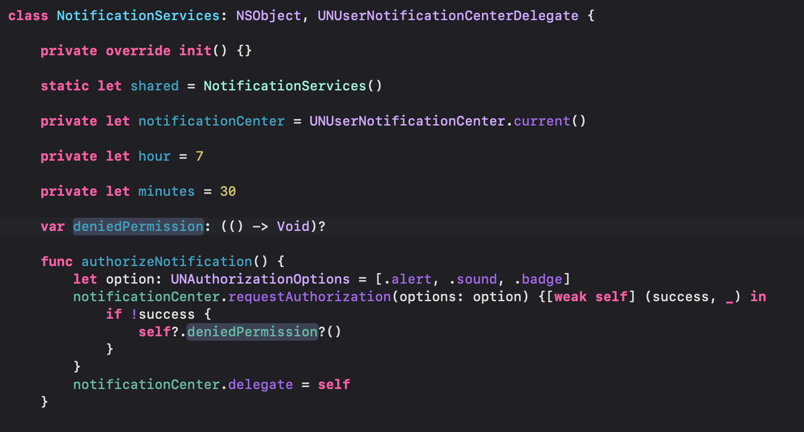 Tiếp theo chúng ta sẽ cài đặt 2 phương thức sau trong class NotificationServices. Phương thức setNotification dùng để tạo và hẹn lịch cho các thông báo, phương thức còn lại có tác dụng remove toàn bộ các thông báo đang chờ khi người dùng tắt chức năng