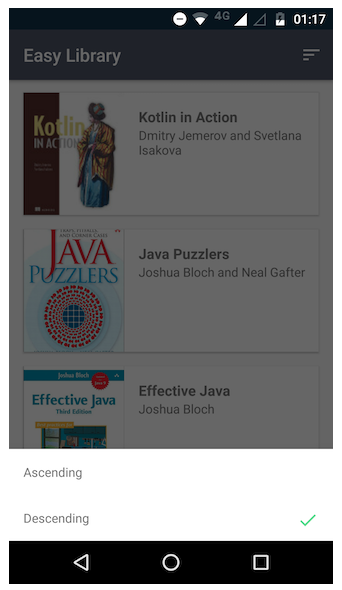 - Làm thế nào để chúng ta làm điều này. Hiện tại thì view trong màn hình này chỉ lắng nghe 1 LiveData, và dữ liệu mà LiveData đó chứa thì được lấy từ Room vì thế nên chúng ta không thể kiểm soát và thay đổi nó trực tiếp. Vậy làm thế nào mà chúng ta có thể làm cho cùng LiveData emit ra list book theo thứ tự khác nhau? Nên nhớ rằng chúng ta cần phải đảm bảo rằng dữ liệu hiển thị của view này vẫn được lấy từ Room.