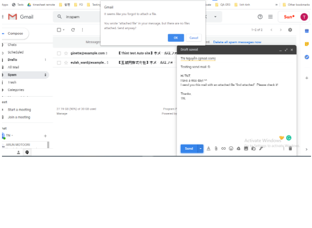 Khi bạn nhập từ ‘find attached’ trong khi soạn email mới và thử gửi email nhưng không có đính kèm bất kỳ 1 file Google nào thì nó sẽ hiện 1 popup nhắc nhở bạn là “bạn đã sử dụng từ “find attached” trong email nhưng không có bất kỳ file nào được đính kèm, bạn vẫn muốn gửi email chứ?”