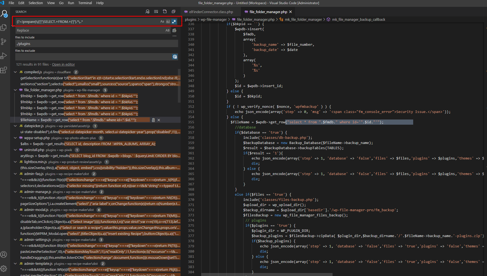 Tiếp theo, chúng ra sẽ dụng regex để tìm ra các đoạn code lỗi tương tự có trong các Wordpress Plugins: